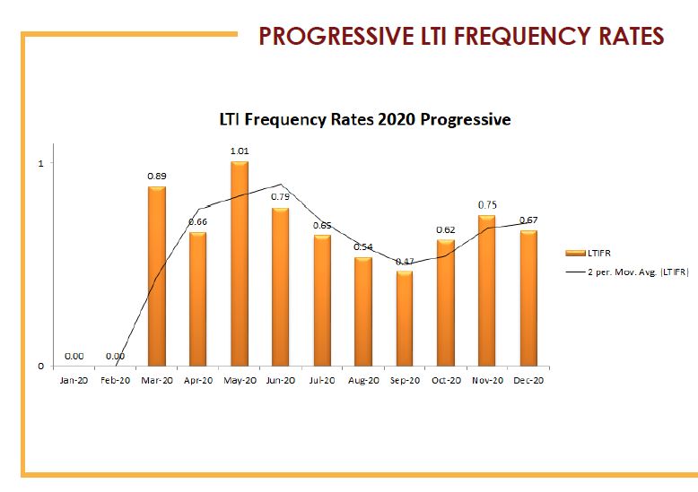 The Progressive Lost Time Injury rate is reflected in the table. The PLTI rate as up to end December 2020 is 0.67, this figure is far below industry trend. Benhaus Mining Services managed to supersede our own benchmarked PLTI rate of 1 by maintaining a rate during the year 2020 of below 1. We value our employees and their safety as a top priority and we proudly stive to continually achieve and year on year improve our safety statistics by thoroughly analysing, improving and evaluation by the safety Management system.